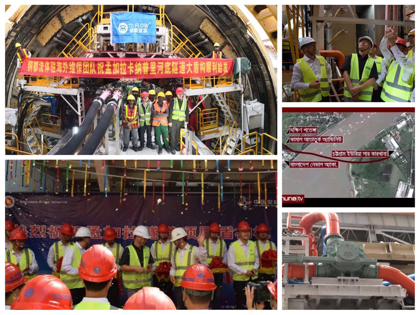 在該項(xiàng)目舉辦的盾構(gòu)機(jī)試運(yùn)轉(zhuǎn)儀式上,中國駐孟加拉大使館經(jīng)參處李光軍參贊出席儀式并發(fā)表重要講話??{普里河河底隧道的建設(shè)不僅會改善孟加拉國國內(nèi)交通運(yùn)輸狀況,同樣也將提升孟中印緬經(jīng)濟(jì)走廊建設(shè)以及該地區(qū)的互聯(lián)互通水平。該項(xiàng)目設(shè)計為雙向四車道,路線全長9265.971米,河底隧道工程總長3.5千米,其中盾構(gòu)段長度2450米,隧道覆土深度31米,設(shè)計水土壓力達(dá)0.59兆帕。這段工程以粉細(xì)砂地質(zhì)為主,極易發(fā)生砂層液化、刀盤結(jié)泥餅、切削面坍塌、排泥口堵塞等施工障礙,項(xiàng)目采用中交天和產(chǎn)Ф12.12m氣墊式泥水平衡盾構(gòu)施工。該盾構(gòu)機(jī)長94米、重2200余噸,是我國自主研發(fā)、出口海外首臺超大直徑泥水氣壓平衡盾構(gòu)機(jī)。