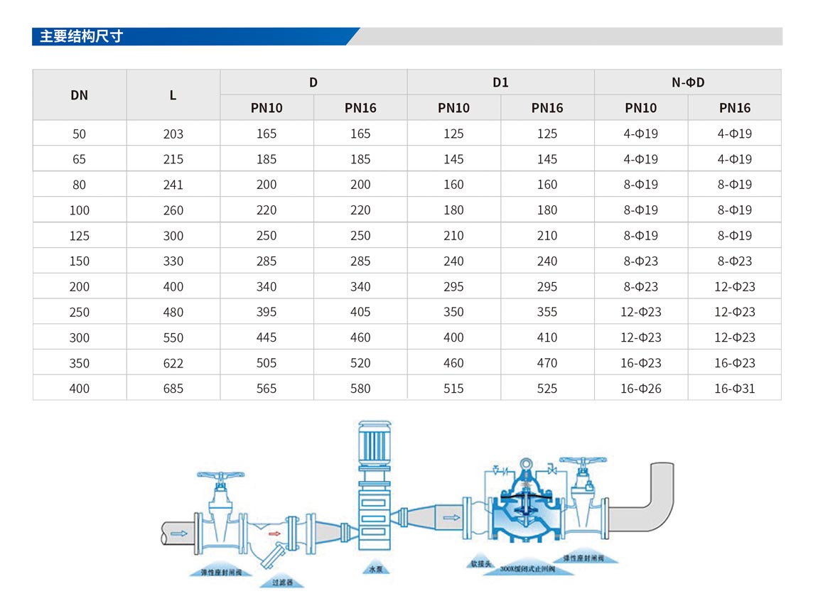 具有開啟和關閉速度調控的逆止閥,于啟動或停止抽水機運轉時,可配合現場調節(jié)至開啟或關閉速度??捎糜诟邔咏ㄖ瑴p少水錘及水聲現象產生,以達安靜關閉之效果。 公稱壓力∶PNI0、PNI6、PN25 隔膜式∶DN50~DN500